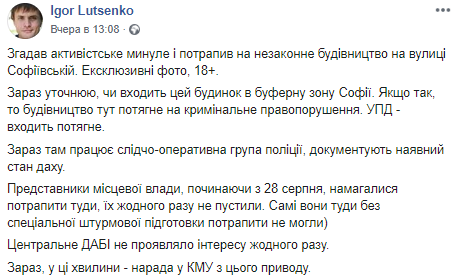 "Вспомнил активистское прошлое и попал на незаконное строительство на улице Софиевской. Эксклюзивные фото, 18+" - написал Луценко и добавил, что он уточняет, входит ли дом в буферную зону Софии. Если это так, то, по его словам, строительство там потянет на уголовное преступление. Позже он написал, что - входит.