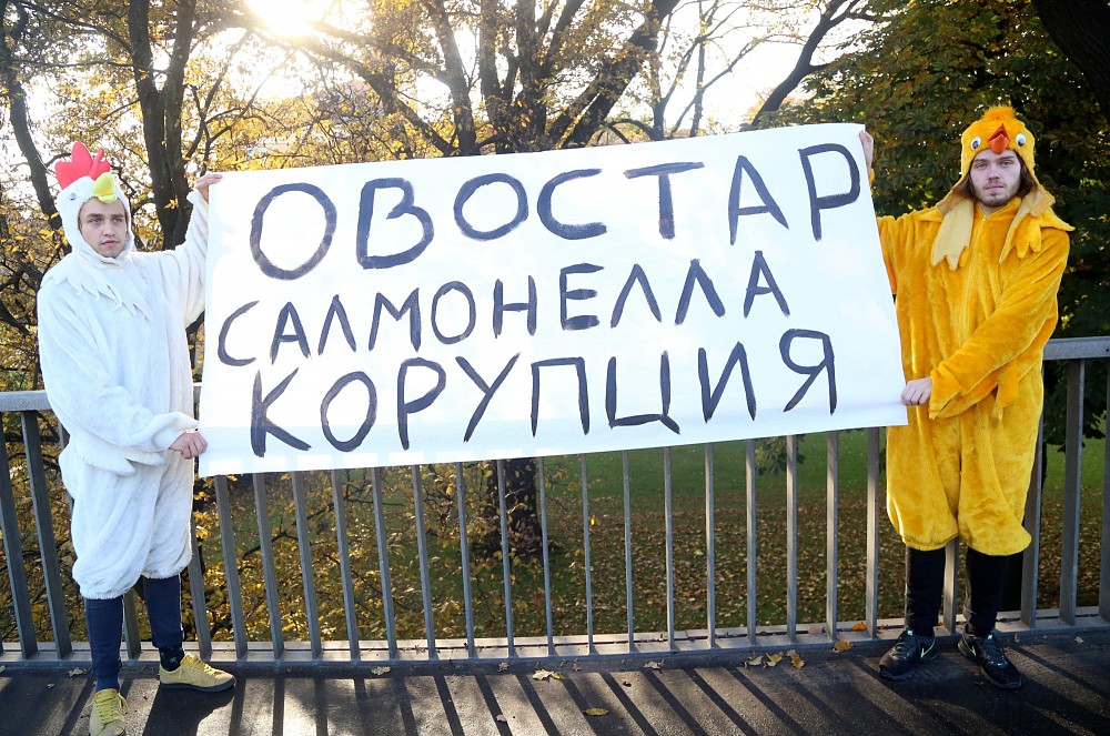 Двое мужчин с плакатом "Oвостар, сальмонелла, коррупция", нарядившись курицами, митинговали на Вантовом мосту возле Рижского замка, где проходила встреча Владимира Зеленского с президентом Латвии Эгилсом Левитсом. Вскоре оба мужчины по просьбе службы безопасности покинули мост.