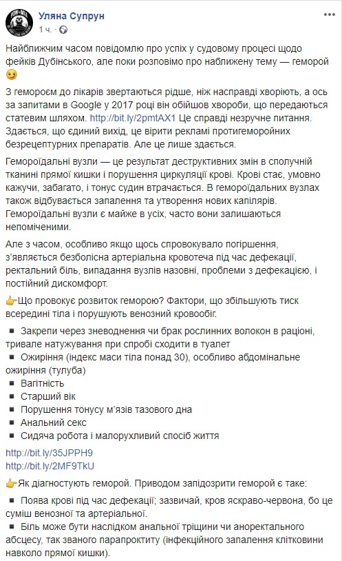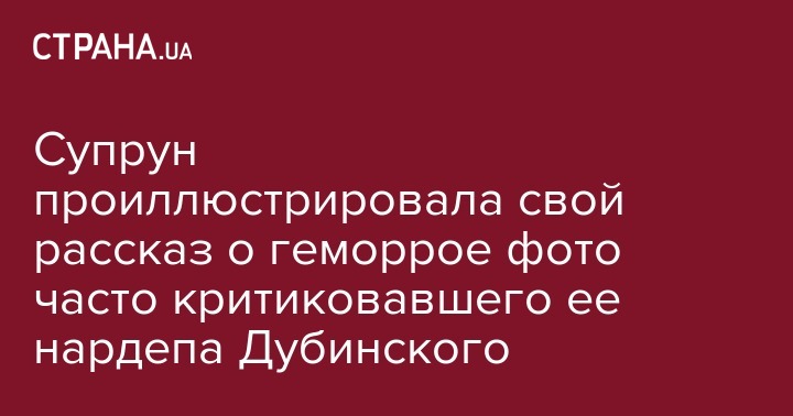 Экс-глава Минздрава Ульяна Супрун дала ответы на вопросы о геморрое и рассказала, как лечить эту неприятную болезнь на своей странице в Facebook, проиллюстрировав пост фотографией народного депутата от Слуги народа Александра Дубинского, который часто критиковал Супрун и на которого она подала в суд за фейки.
