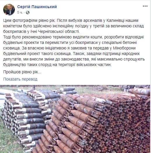 Он написал в Facebook следующее: "Этим фотографиям ровно год. После взрывов арсеналов в Калиновке нашим комитетом была осуществлена инспекционная поездка на третий по величине склад боеприпасов в Ичне Черниговской области. Тогда было рекомендовано срочно выделить средства, разработать соответствующие строительные проекты и переместить все боеприпасы в специальные бетонные хранилища. По собственной инициативе я заказал и передал в Минобороны строительный проект такого хранилища. Также, благодаря поддержке народных депутатов, мы внесли изменения в законодательство, которые максимально упрощают строительство таких сооружений на территории воинских частей".