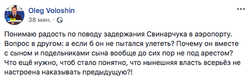 "Понимаю радость по поводу задержания Свинарчука в аэропорту. Вопрос в другом: а если б он не пытался улететь? Почему он вместе с сыном и подельниками сына вообще до сих пор не под арестом? Что еще нужно, чтоб стало понятно, что нынешняя власть всерьез не настроена наказывать предыдущую?!"