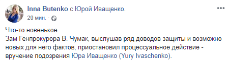 "Зам генпрокурора В. Чумак, выслушав ряд доводов защиты и возможно новых для него фактов, приостановил процессуальное действие - вручение подозрения Юрию Иващенко", - написала адвокат Бутенко.