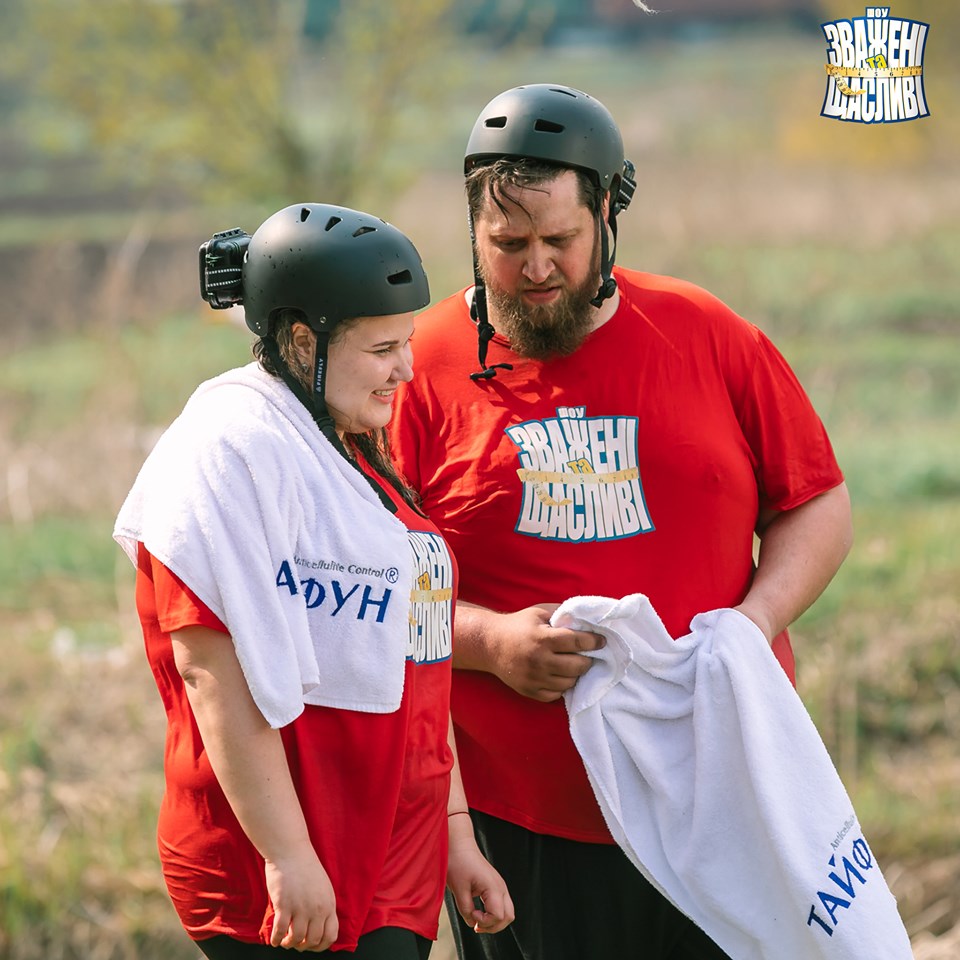 Первый конкурс заставил мужчин в буквальном смысле изваляться в грязи. Каждый из них должен был спуститься в ров с жижей, а затем подняться по канату на платформу, чтобы участницы собрали с него грязь в специальную колбу. Той из них, которая соберет больше всего пообещали бонус: -2 кг на взвешивании для своего мужчины из пары. А также +1 и -1 кг, которые она по желанию сможет добавить другим участникам при подведении итогов.
