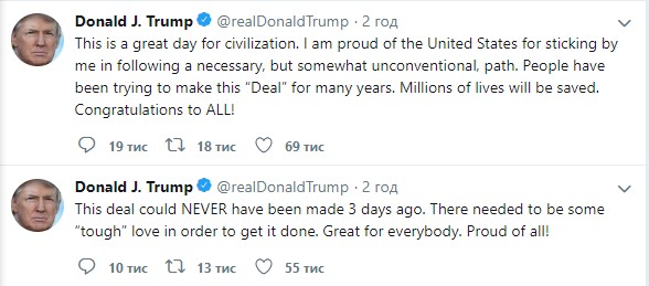 "Это великий день для человечества. Я горжусь Соединенными Штатами за то, что мне доверили следовать по этому неординарному, но правильному пути (решения проблемы - Ред.). Люди пытались заключить эту "сделку" долгие годы. Миллионы жизней будут спасены. Поздравляю всех!" - добавил Трамп.
