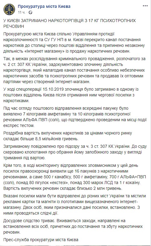 Прокуратура Киева задержала торговца наркотиками, который продавал психотропные препараты на территории страны через почтовое отделение.