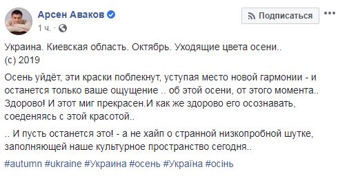 Также он предложил перевести внимание с "хайпа о странной низкопробной шутке" на "уходящие цвета осени", приложив фотографию пейзажа в Киевской области. "И пусть останется это (ощущение осени). А не хайп о странной низкопробной шутке, заполняющей наше культурное пространство сегодня", - написал глава МВД.