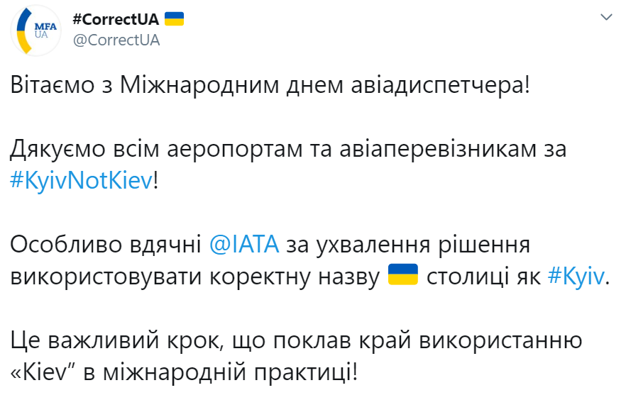 "Спасибо всем аэропортам и авиаперевозчикам за KyivNotKiev! Особенно благодарны IATA за принятие решения использовать корректное название украинской столицы как Kyiv. Это важный шаг, который положил конец использованию Kiev в международной практике", - говорится в сообщении.