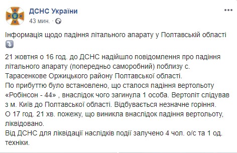 В понедельник, 21 октября, в Полтавской области, в результате падения четырехместного вертолета "Робинсон-44", погиб один человек. Об этом сообщает Госслужба Украины по ЧС на своей странице в Facebook.