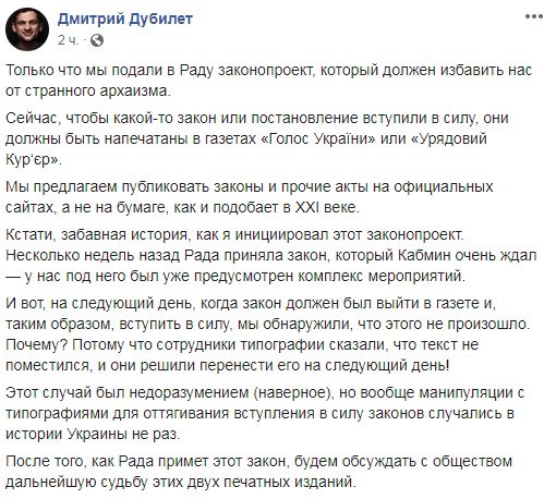 Дубилет завил, что правительство предлагает публиковать законы и прочие акты на официальных сайтах и утвердило соответствующий законопроект в среду. "Только что мы подали в Раду законопроект, который должен избавить нас от странного архаизма...Мы предлагаем публиковать законы и прочие акты на официальных сайтах, а не на бумаге, как и подобает в XXI веке", - заявил Дубилет.