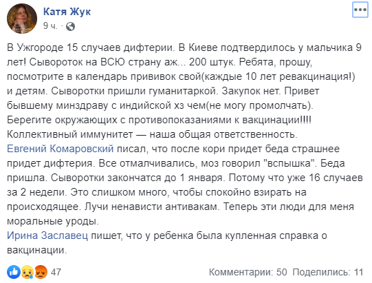 Евгений Комаровский писал, что после кори придет беда страшнее придет дифтерия. Все отмалчивались, МОЗ говорил "вспышка". Беда пришла. Сыворотки закончатся до 1 января. Потому что уже 16 случаев за 2 недели. Это слишком много, чтобы спокойно взирать на происходящее. Лучи ненависти антивакам. Теперь эти люди для меня моральные уроды.