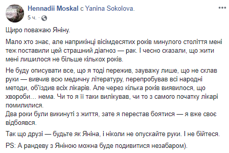 "Не буду описывать все, что я тогда пережил, замечу только, что не сложил руки - изучил всю медицинскую литературу, перепробовал все народные методы, объездил всех врачей. Но через несколько лет оказалось, что болезни ... нету. То ли я ее таки вылечил, то ли с самого начала врачи ошиблись. Два года были выброшены из жизни, зато я перестал бояться - я уже свое отбоялся", - написал Геннадий Москаль и опубликовал фото с телеведущей Яниной Соколовой, которая сейчас также борется с онкологическим заболеванием.