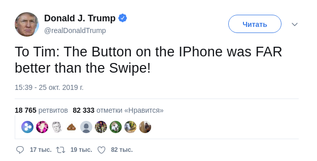 Американскому президенту Дональду Трампу не понравился дизайн новых IPhone. В частности, Трампу не удобно пользоваться без кнопки Home. Он публично сообщил об этом гендиректору Apple Тиму Куку в Twitter в пятницу, 25 октября.