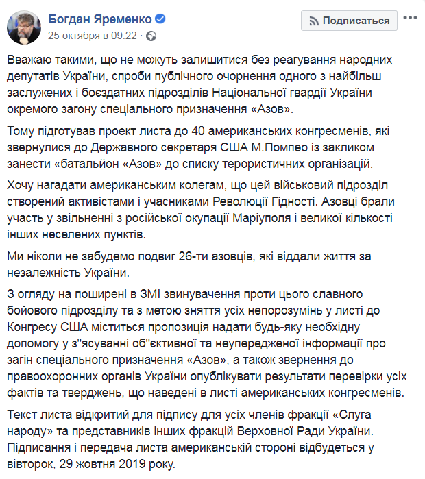"Хочу напомнить американским коллегам, что это военное подразделение создано активистами и участниками революции достоинства. Азовцы участвовали в освобождении из российской оккупации Мариуполя и множества других населенных пунктов. Мы никогда не забудем подвиг 26 азовцев, отдавших жизнь за независимость Украины", - написал в посте "слуга народа".