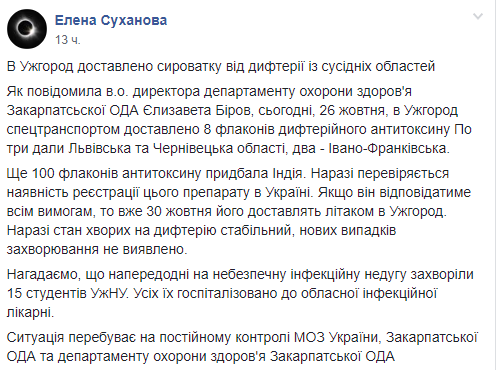 "В субботу, 26 октября, в Ужгород спецтранспортом доставили 8 флаконов дифтерийного антитоксина. По три дали Львовская и Черновицкая области, два - Ивано-Франковская", - говорится в сообщении.