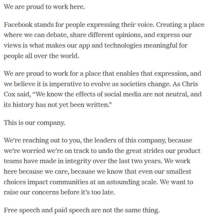 Дезинформация затрагивает всех нас. Наша текущая политика по проверке политических постов, является угрозой тому, за что выступает FB. Мы решительно возражаем против этой политики в ее нынешнем виде. Она не защищает голоса, и позволяет политикам использовать нашу платформу, ориентируясь на людей, которые считают, что контент, публикуемый политическими деятелями, заслуживает доверия", - говорится в письме.