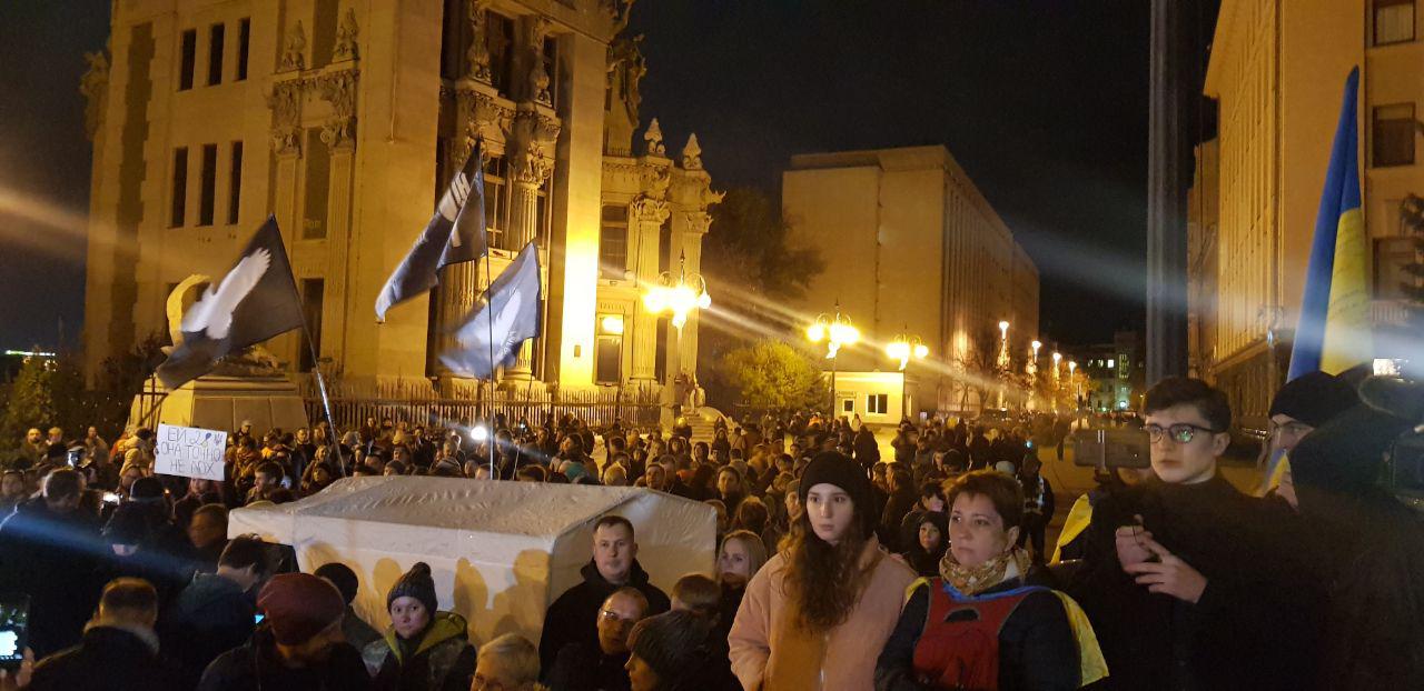 По словам спикеров митинга, отвод войск в Золотом - это подыгрывание Путину и проигрыш в войне. Участники митинга держат в руках плакаты с антипрезидентской риторикой. Кроме того, под ОП установили палатки. Охрану порядка обеспечивает полиция диалога, их не более 30 человек.