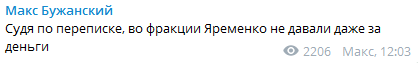 "Судя по переписке, во фракции Яременко не давали даже за деньги" – пишет его однопартиец Макс Бужанский.