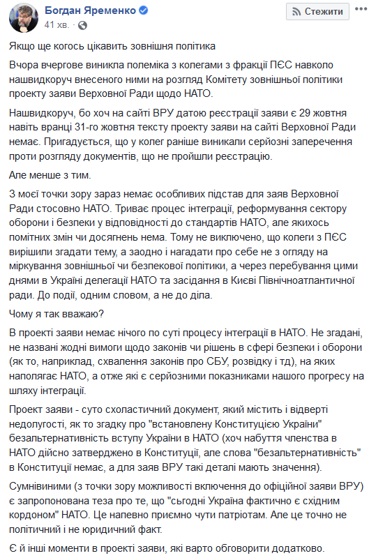 "Вчера в очередной раз возникла полемика с коллегами из фракции ПЕС вокруг наспех внесенного ими на рассмотрение Комитета внешней политики проекта заявления Верховной Рады относительно НАТО.