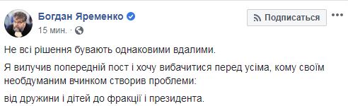 "Уважаемые украинцы, позвольте мне пожалуйста перед вами извиниться за Богдана Яременко. Не буду давать оценку его личным качествам. Я извиняюсь перед вами за то, что человек, которому моя политическая сила предоставила мандат доверия, в оплаченное вами - налогоплательщиками - рабочее время договаривается о встрече с проституткой.