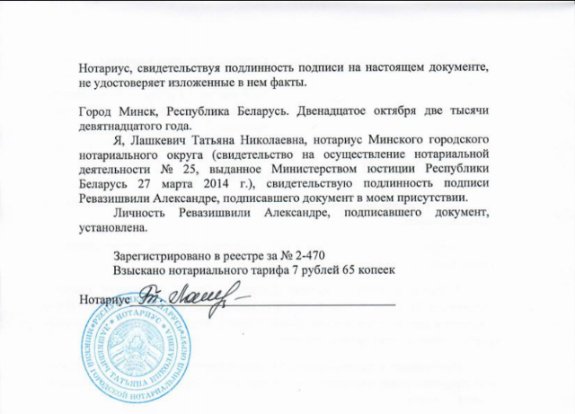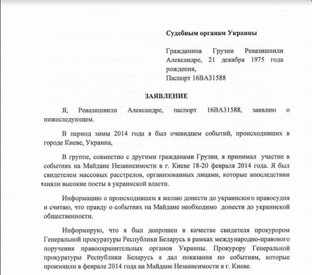 Адвокат, представляющий интересы экс-сотрудников "Беркута" в Святошинском суде Киева, где слушается дело о якобы их причастности к массовым расстрелам людей на Майдане в феврале 2014 года, Александр Горошинский предоставил копию одного из нотариально заверенных заявлений одного из "грузинских снайперов" Александра Ревазишвили.