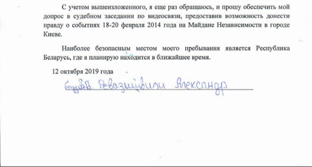 С учетом вышеизложенного, я еще раз обращаюсь и прошу обеспечить мой допрос в судебном заседании по видеосвязи, предоставив возможность донести правду о событиях 18-20 февраля 2014 года на Майдане Независимости в городе Киеве. …".
