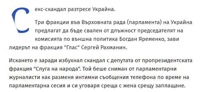 Болгарские "Вести" пишут о том, что Яременко могут исключить из фракции за интимную переписку на работе. По словам трех фракций, стремящихся отстранить Яременко от должности, его поведение содержит "элементы оскорбления законодательной власти и заявления, которые могут быть истолкованы как угроза для журналистов, что недопустимо и неприемлемо", говорится в статье.