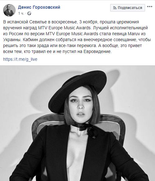 Радиоведущий Макс Назаров: "Сегодня ночью наша украинка Maruv стала лучшей российской исполнительницей по версии MTV Europe Music Awards. Всегда приятно наблюдать, когда украинцы без лишнего пафоса, тихонько так побеждают.
