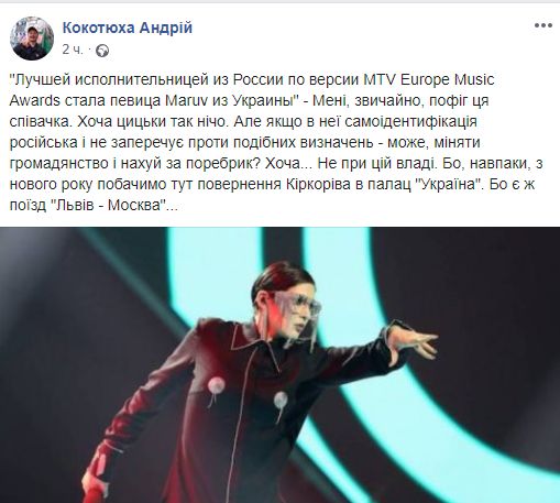 Украинский писатель Андрей Кокотюха: "Лучшей исполнительницей из России по версии MTV Europe Music Awards стала певица Maruv из Украины" - Мне, конечно, пофиг эта певица. Хотя сиськи так ничего. Но если у нее самоидентификация русской и она не возражает против подобных определений - может, менять гражданство и на**й за поребрик? Хотя ... Не при этой власти. Потому, наоборот, с нового года увидим здесь возврат Киркорова во дворец "Украина". Потому что есть же поезд "Львов - Москва"..."