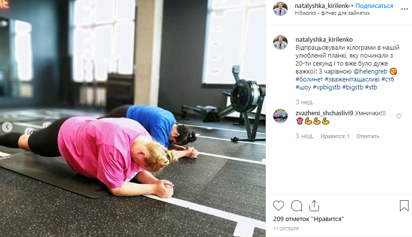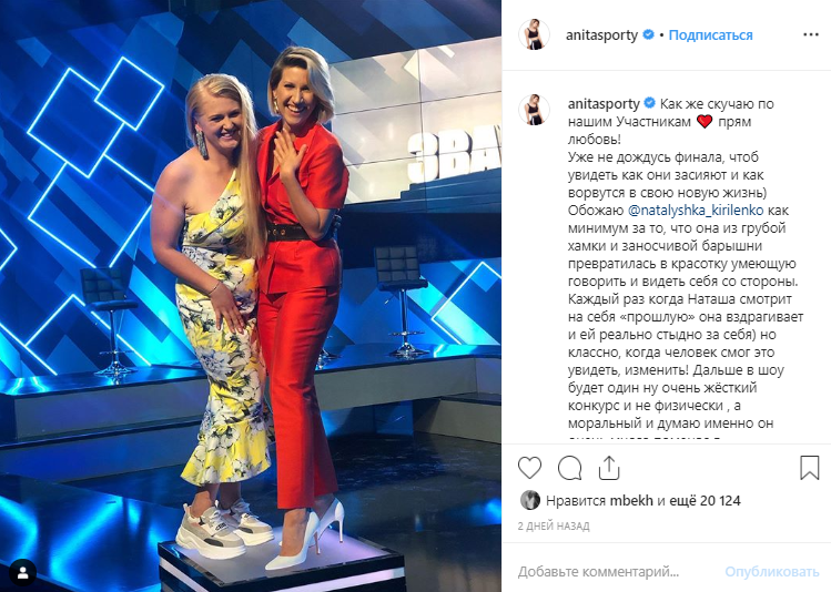 В Instagram ведущей проекта Аниты Луценко появилась свежее фото Наташи Кириленко, которая на взвешивании постшоу показала вес в 77 килограммов.