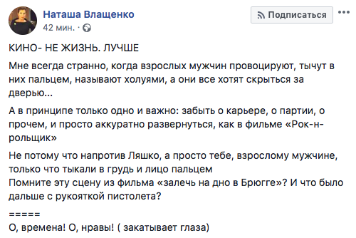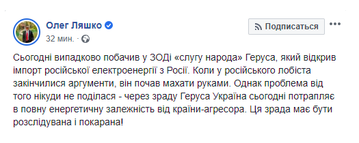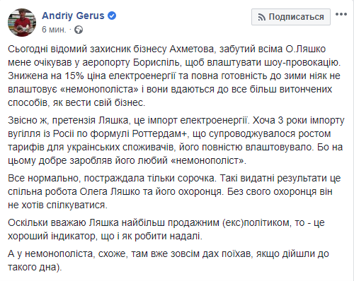 "Сегодня известный защитник бизнеса Ахметова, забытый всеми Ляшко меня ожидал в аэропорту Борисполь, чтобы устроить шоу-провокацию. Сниженная на 15% цена электроэнергии и полная готовность к зиме не устраивает "немонополиста" и они прибегают ко все более изощренным способам, как вести свой бизнес.