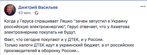 Только налоги ДТЕК идут в украинский бюджет, а от российских производителей в оборонку России..." - пишет Дмитрий Васильев.
