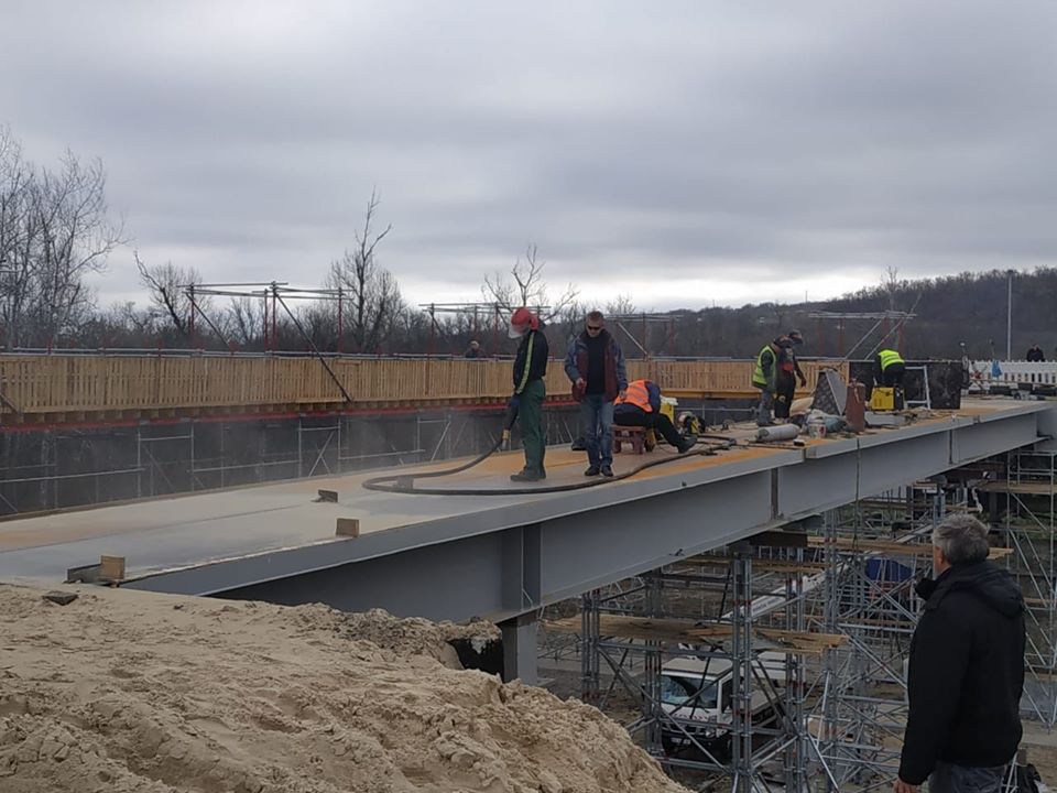 Отмечается, что градостроители завершили укладку металлоконструкций и проводят их сварку. Идет обработка пролетов моста с помощью пескоструйного аппарата. Также проводится разрез железных остатков разрушенного моста.