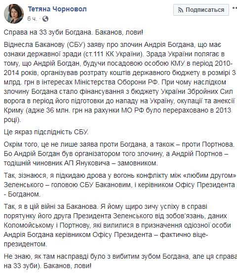 "Дело на 33 зуба Богдана. Баканов, лови!", - написала она, намекнув на слухи о драке на Банковой глав ОП и СБУ. Черновол отметила, что отнесла главе СБУ Ивану Баканову заявление о преступлении Андрея Богдана, имеющего признаки государственной измены (ст. 111 УК Украины).