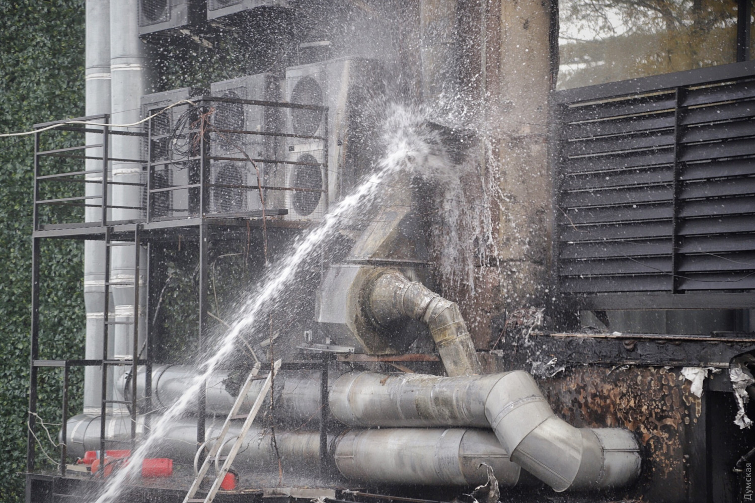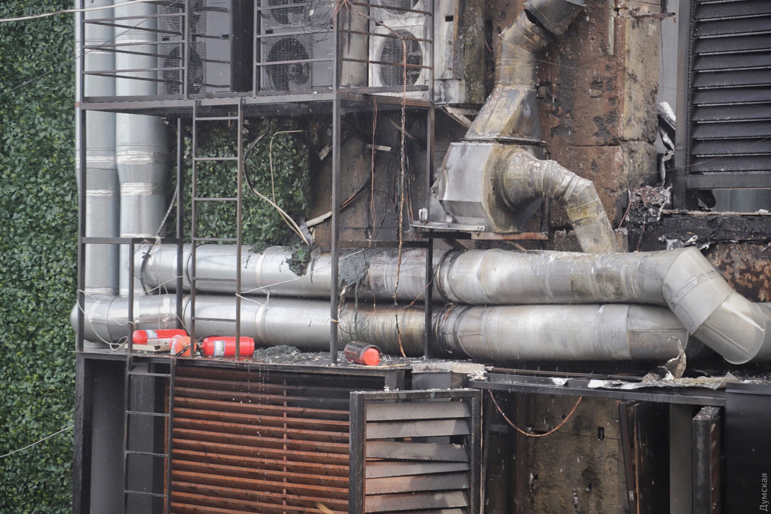 На здании видны обгоревшие трубы вентиляции и кондиционеры. Вокруг много огнетушителей, сотрудники гостиницы пытались потушить пожар своими силами. По предварительной информации, пожар начался в помещении кухни.