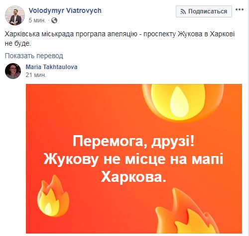 "Харьковской горсовет проиграл апелляцию - проспекта Жукова в Харькове не будет", - написал Вятрович.