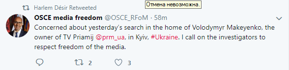 В ОБСЕ обеспокоены обысками, которые прошли у владельца телеканала Прямой Владимира Макеенко. Об этом сообщил представитель ОБСЕ по свободе СМИ Арлем Дезир в Твиттере.