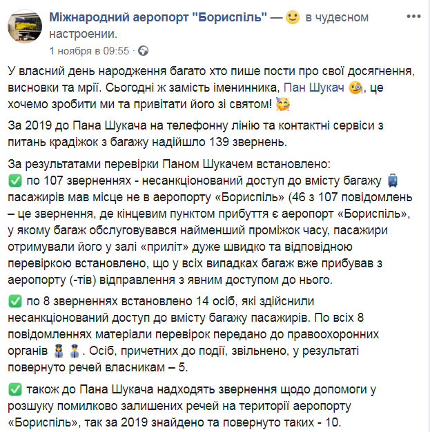 Также в аэропорт поступают просьбы помочь разыскать вещи, по ошибке оставленные на территории "Борисполя". За 2019 год было найдено и возвращено 10 утерянных вещей.