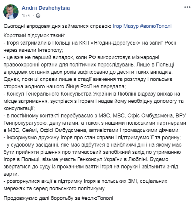 "На задержанного в Польше украинского ветерана войны с РФ унсовца Игоря Мазура (Тополя) была выставлена не красная карточка Интерпола, которая сразу бросается в глаза нашим полицейским и пограничникам при пересечении границы, а специальное циркулярное сообщение, что-то вроде оперативного ориентирования о задержании, распространение которого было ограничено определенными странами. Учитывая механизм объявления в розыск Россией нашего ветерана, есть признаки злоупотребления Уставом Интерпола", - пишет Шевченко.
