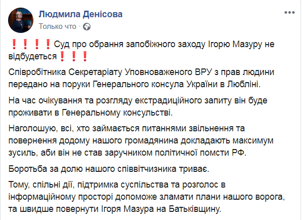 По сообщению омбудсмена, Мазура, который является сотрудником секретариата уполномоченного ВРУ по правам человека, передали на поруки генерального консула Украины в Люблине. В период ожидания и рассмотрения экстрадиционного запроса Мазур будет проживать в генеральном консульстве.