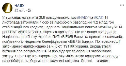 В понедельник, 11 ноября, сотрудники НАБУ задержали семерых подозреваемых по делу о VAB Банке, включая бывших и действующих чиновников Нацбанка. Об этом бюро сообщило на своей странице в Facebook.