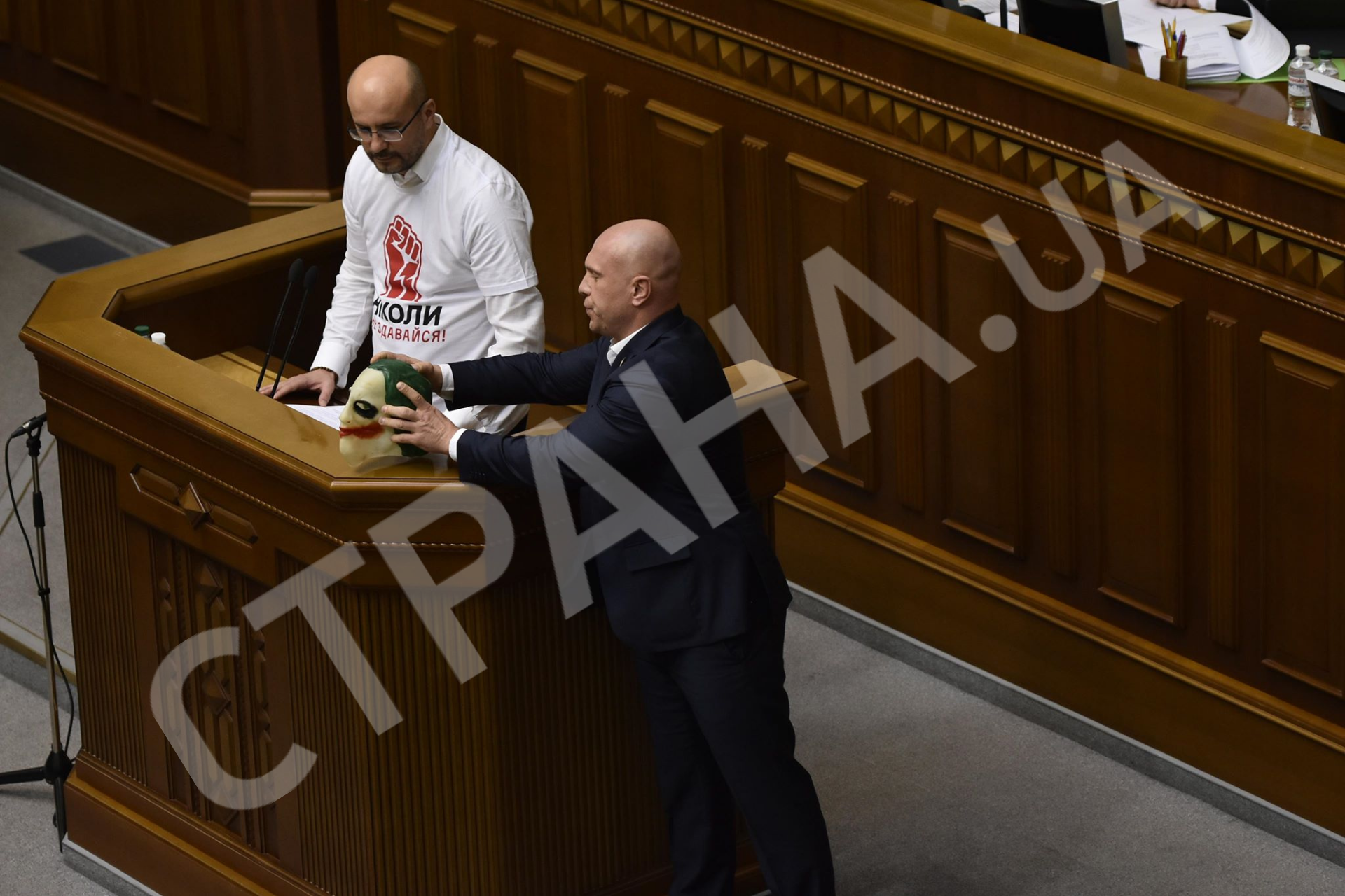 Потом Кива снял маску и положил ее на трибуну Верховной Рады, когда там выступал новоиспеченный нардеп Сергей Рудык, который только сегодня принял депутатский мандат.