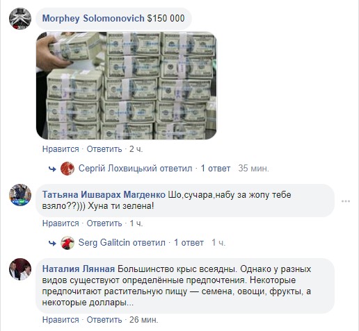 "Ща НАБУ тебе оборудует домик за казенный счет. Лет на 10", "Ничего страшного. За решеткой отдохнешь", "В тюрьме теперь за едой нормальной соскучишься!!!", " Большинство крыс всеядны. Однако у разных видов существуют определённые предпочтения. Некоторые предпочитают растительную пищу — семена, овощи, фрукты, а некоторые доллары..." - пишут люди в комментариях под постом.