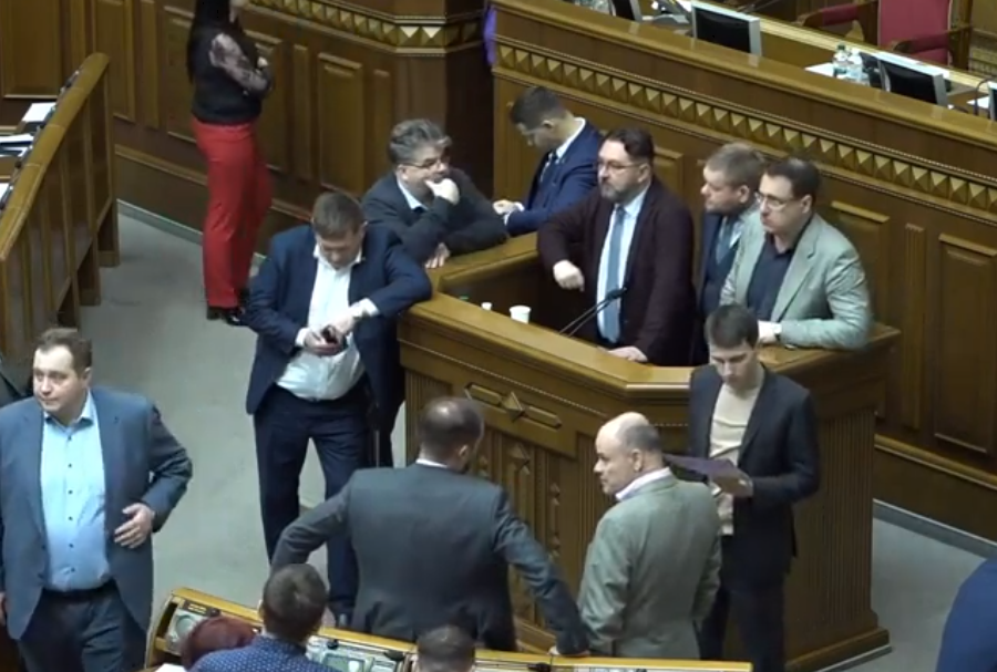 14:40 "Оппозиционная платформа" заблокировала трибуну Рады. Однако Разумков разрешил выступать с места.