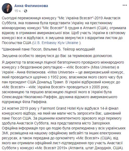 Суббота должна лететь в США 27-го ноября и еще может получить визу. Но для ускорения процесса и его положительного решения Филимонова решила обратиться к послу Уильяму Тейлору. Официальное письмо Анна также разместила на страницах в Facebook.