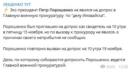 "Порошенко был приглашен на допрос как свидетель на 10.00 в пятницу, 15 ноября, но по вызову к прокурору не явился", - заявил Лещенко. По данным Лещенко, Порошенко повторно вызвали на допрос на 10.00 19 ноября.