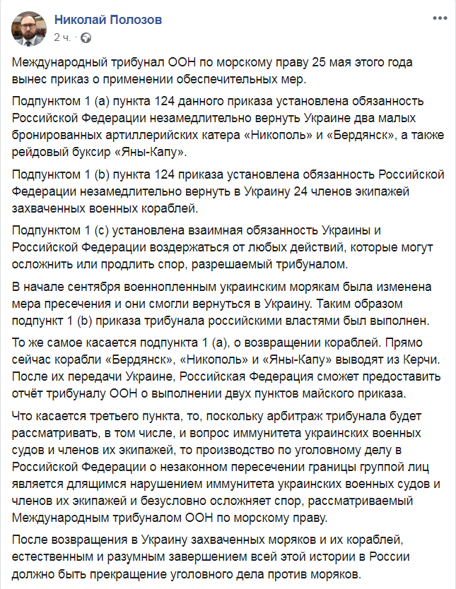 "В начале сентября военнопленным украинским морякам была изменена мера пресечения и они смогли вернуться в Украину. Таким образом подпункт 1(b) приказа трибунала российскими властями был выполнен. То же касается подпункта 1 (a) о возвращении кораблей. Прямо сейчас корабли "Бердянск", "Никополь" и "Яны-Капу" выводят из Керчи. После их передачи Украине РФ сможет предоставить отчет трибуналу ООН о выполнении двух пунктов майского приказа", - написал Полозов.