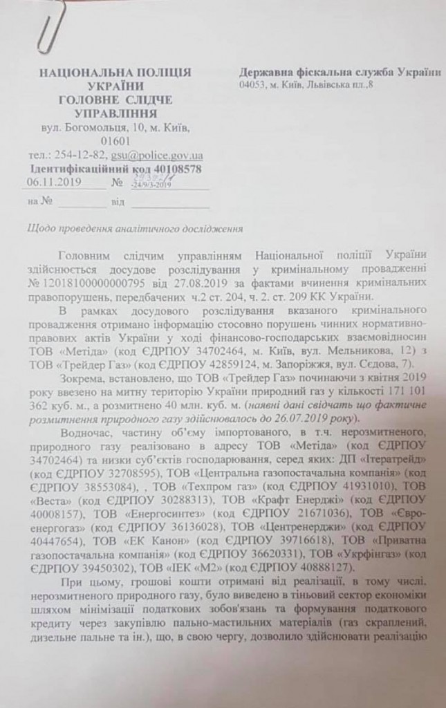 Сотрудники Главного следственного управления полиции Украины совместно с Государственной фискальной службой начали расследование по подозрению в контрабанде газа, уклонении от уплаты НДС, фиктивном налоговом кредите и непоставках газа потребителям по предоплате.