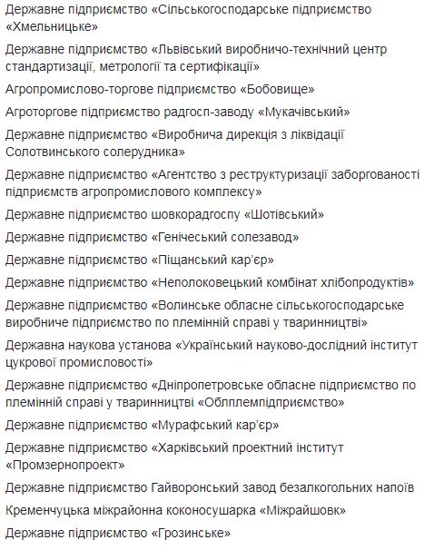 Министр развития экономики, торговли и сельского хозяйства Тимофей Милованов опубликовал перечень госпредприятий, подконтрольных его ведомству, руководители которых были уволены. Список Милованов опубликовал в Facebook.