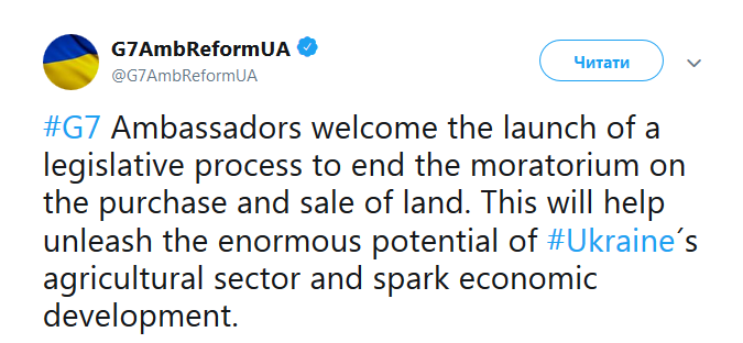 "Послы G7 приветствуют начало законодательного процесса по прекращению моратория на покупку и продажу земли. Это поможет раскрыть огромный потенциал сельскохозяйственного сектора Украины и стимулировать экономическое развитие", - заявили дипломаты.