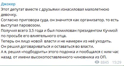"Этот депутат вместе с друзьями изнасиловал малолетнюю девочку. Согласно приговора суда, он значится как организатор, то есть выступал паровозом. Получил всего 3,5 года и был помилован президентом Кучмой по просьбе его влиятельного отца", - сообщил пранкер. И добавил, что теперь Иванисов - "лицо новой власти и не намерен из неё уходить".